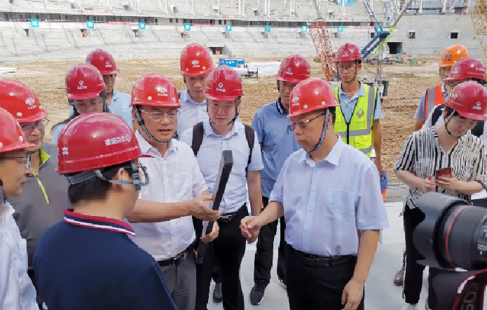 这是CFRP平行板索在大型建筑的首次成功应用。大型建筑桥梁工程中,钢索是普遍存在的,是保持大型结构的关键部件。CFRP索本身对比钢索,在自身重量、拉伸强度、耐腐蚀性、安装维护等,有着显著的优势,而其存在的问题是缺乏类似钢索长期运用的工程技术与经验。而这些技术与经验的积累是需要了解CFRP、同时在建筑领域勇于创新的优秀企业来引领——中冶建院就是这样的卓越的企业。这样的应用创新企业越多,就能形成我们自主开发与掌控的生态链,成为“中国智造”,这无疑是我国碳纤维产业持续健康发展最重要的保障。8月18日,中冶建研院董事长、中国工程院院士岳清瑞一行赴三亚体育场项目考察交流,观摩研讨中冶建研院牵头研发的波形锚CFRP平行板索在三亚体育场索结构中的应用成效。该项目是CFRP板索在大跨体育场实际工程中的首次大规模应用,属于国际首创,对于CFRP材料在大跨空间结构乃至于新建结构中的推广应用具有重要的引领作用和里程碑意义。
